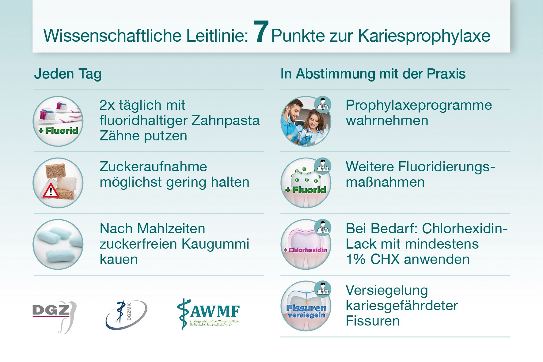 Abb. 1: Neben dem zweimal täglichen Zähneputzen mit fluoridhaltiger Zahnpasta und einem möglichst geringen Zuckerkonsum gehört das Kauen zuckerfreier Kaugummis nach Mahlzeiten zu den täglich empfohlenen Prophylaxemaßnahmen der aktuellen Kariesprophylaxe-Leitlinie. © DGZ, DGZMK, AWMF