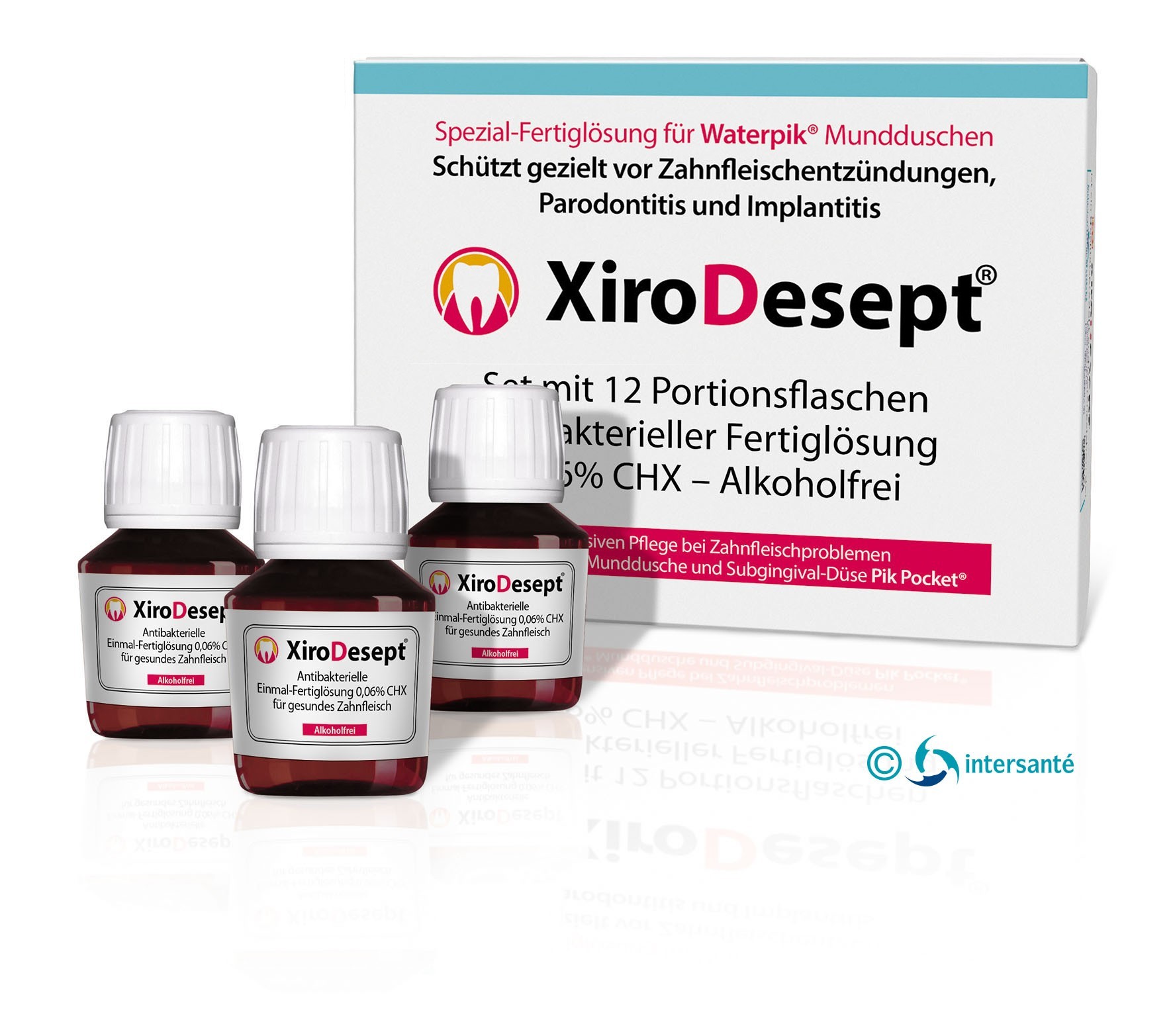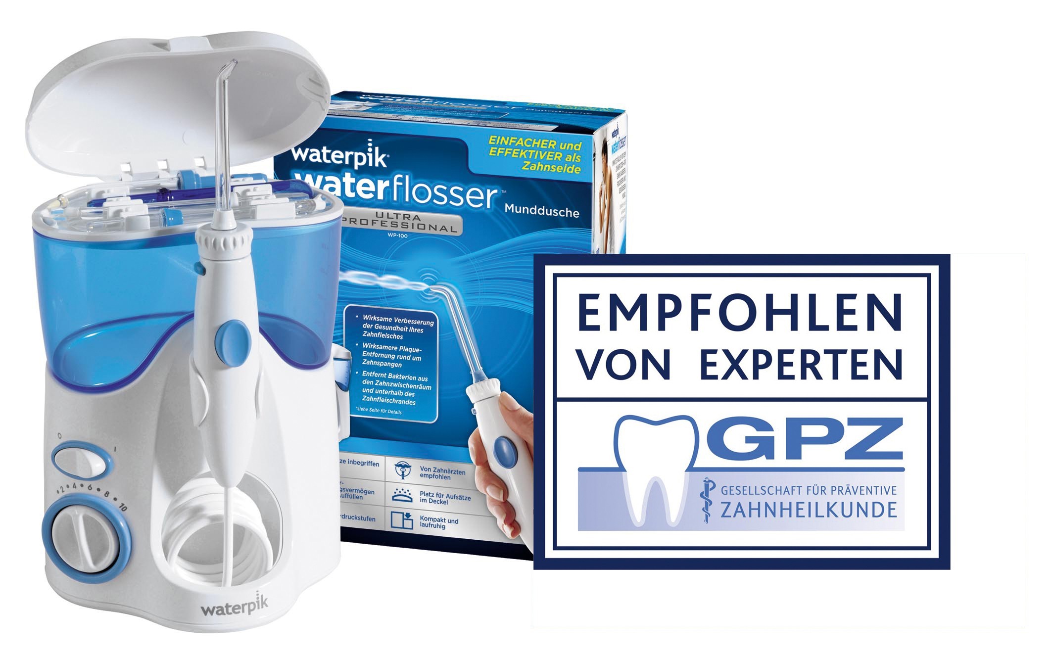 Links: XiroDesept® Fertiglösung (0,06% Chlorhexidin). Rechts: Munddusche Waterpik® WP-100E4.