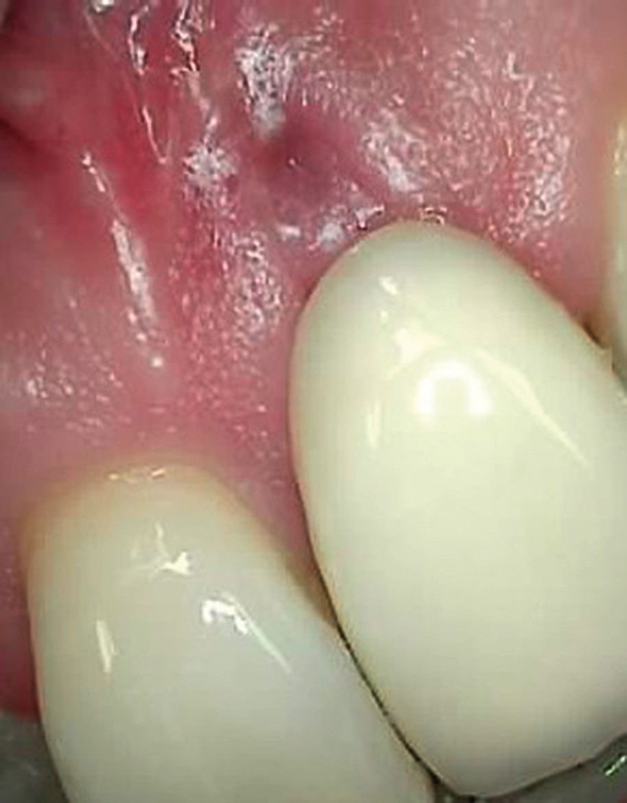 Eine 42-jährige Patientin, starke Raucherin mit regelmäßiger Einnahme von Immunsuppressiva. Im Jahre 2009 wurde ihr Regio 21 ein Implantat inseriert. Sie kam regelmäßig alle sechs Monate zur Prophylaxesitzung. Die Sondierungstiefen waren im Laufe der Jahre stabil, diese lagen bei maximal drei Millimetern. Vor einigen Wochen stellte sich die Patientin nun mit einer vestibulären Fenestration an diesem Implantat vor. Durch den behandelnden Kieferchirurgen wurde eine dentalhygienisch ungünstig gestaltete Suprakonstruktion bemängelt, darüber hinaus wurde aber keine Therapie durchgeführt. Wir statteten auch diese Patientin mit der Munddusche Waterpik® WP-100E4 aus. Sie sollte die Fenestration bei empfohlener niedrigster Druckstufe mit XiroDesept® Fertiglösung (0,06 % Chlorhexidin) mithilfe der Gingival Pik Pocket-Aufsteckdüse einmal täglich gezielt ausspülen. Nach circa drei Wochen erfolgte die erste Nachkontrolle. Die klinische Situation hatte sich bereits stark verbessert; nach weiteren zwei Wochen Anwendung war der Defekt komplett geschlossen.