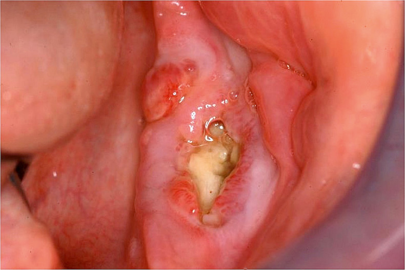 Die Bisphosphonat-assoziierte Kiefernekrose (Osteonecrosis of the Jaw: BP- ONJ) ist definiert „durch einen exponierten Kieferknochen der Mandibula und/oder der Maxilla, der trotz adäquater Betreuung seit länger als acht Wochen freiliegt, bei vorausgegangener Medikation durch Bisphosphonate, ohne dass der Patient eine Strahlentherapie im Kopf-Hals-Bereich erhielt oder erhält“ (Abb. 4).14