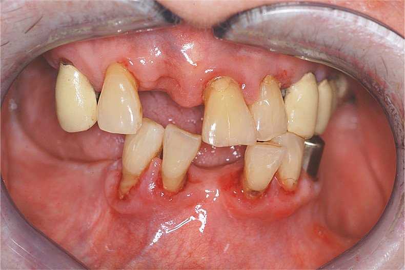 Die im Verlauf einer antihypertonen oder antikonvulsiven Arzneimitteltherapie auftretenden gingivalen Wucherungen werden zunächst konservativ durch eine supra- und subgingivale Belagentfernung behandelt (Abb. 1a–c, 3a und b). Erst wenn nach wiederholten professionellen Zahnreinigungen mit Mundhygieneanweisungen weit ausgedehnte, medikamentös induzierte, gingivale Wucherungen die Kaufunktion beeinträchtigen und eine Zahnpflege erheblich erschweren, ist eine chirurgische Reduktion durch eine Gingivektomie und Gingivoplastik unumgänglich.