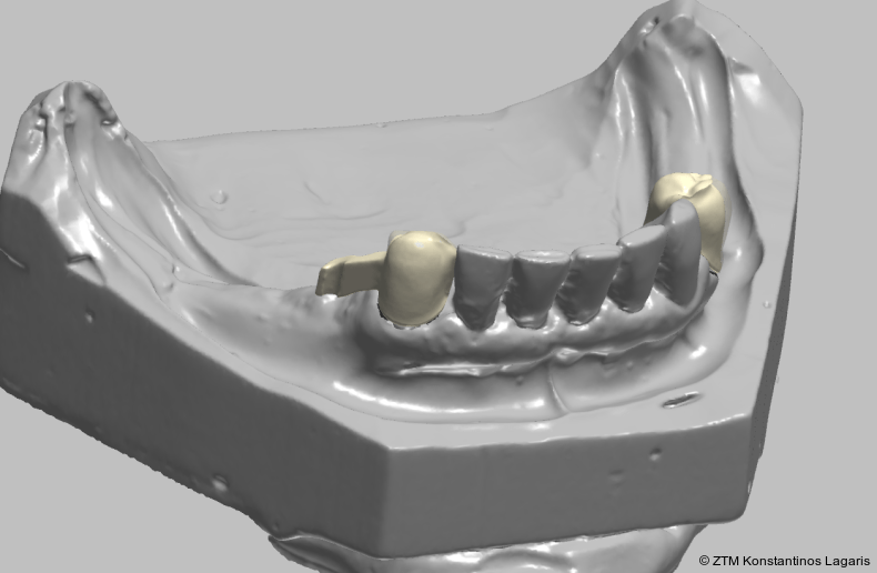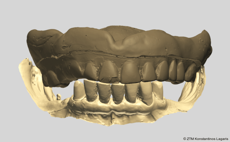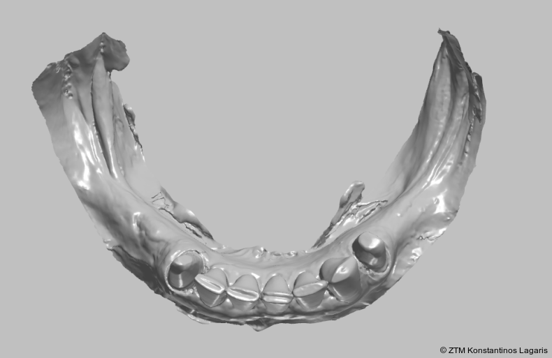 Im Unterkiefer sollte eine Teleskopprothese mit Primärteilen auf den Zähnen 34 und 43 aus CoCr gefertigt werden. Die Patientin war im Oberkiefer zahnlos und mit einer Totalprothese versorgt, die jedoch erneuert werden sollte. Als Ausgangsbasis lagen uns ein Intraoralscan des Unterkiefers sowie ein Scan der unterfütterten Oberkieferprothese vor.