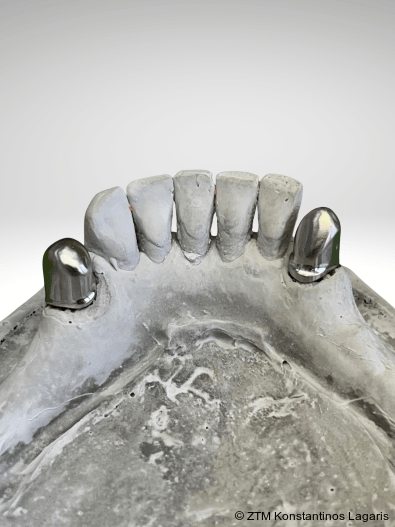 Parallel zur Oberkieferprothese wurden im Unterkiefer mit dem Dental Designer von 3Shape die Innenteleskope konstruiert. Die Fertigung erfolgte im hauseigenen Fertigungszentrum LAC Laser Add Center GmbH mittels 3D-Druck im SLM-Verfahren (Selektives Lasermelting bzw. Metall-3D-Druck).