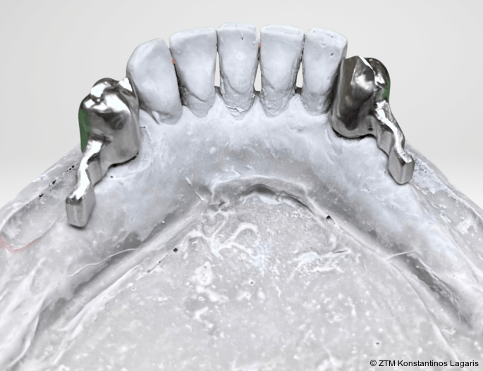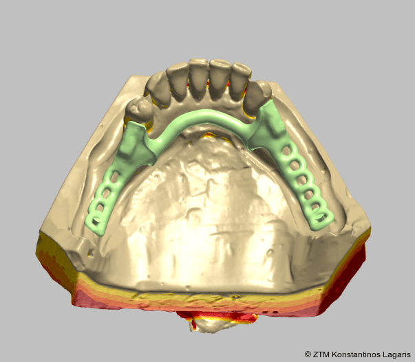 Sobald die Sekundärkronen fertig konstruiert waren, ging es an den Modellguss. Es war ein einfacher Transversalbügel mit Lochretentionen an den Freiendsätteln geplant. In 3Shape besteht die Möglichkeit, das Modell mit der designten Konstruktion zu kombinieren und als einen Datensatz auszugeben. Auf diesem zusammengeführten Datensatz wurde nun direkt der Modellgussbügel designt. Auf diese Weise ließ sich Zeit sparen, da nicht gewartet werden musste, bis die Sekundärteleskope vollständig fertiggestellt waren.