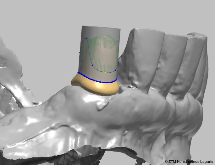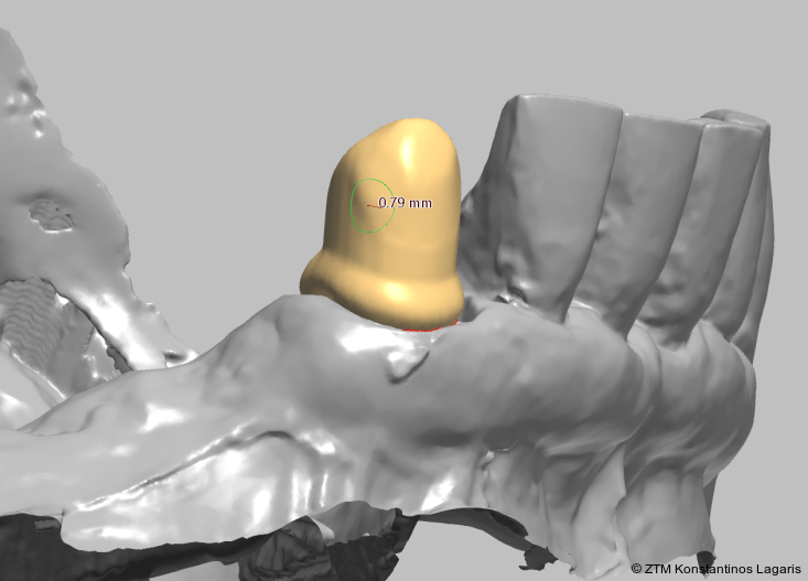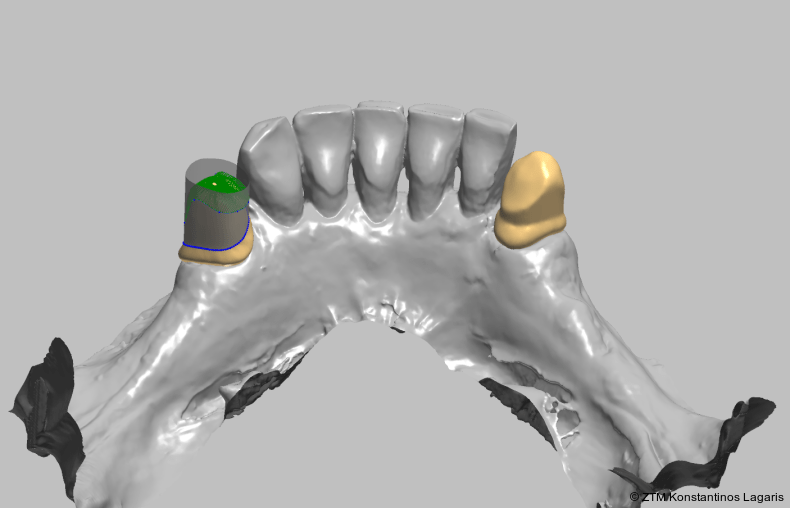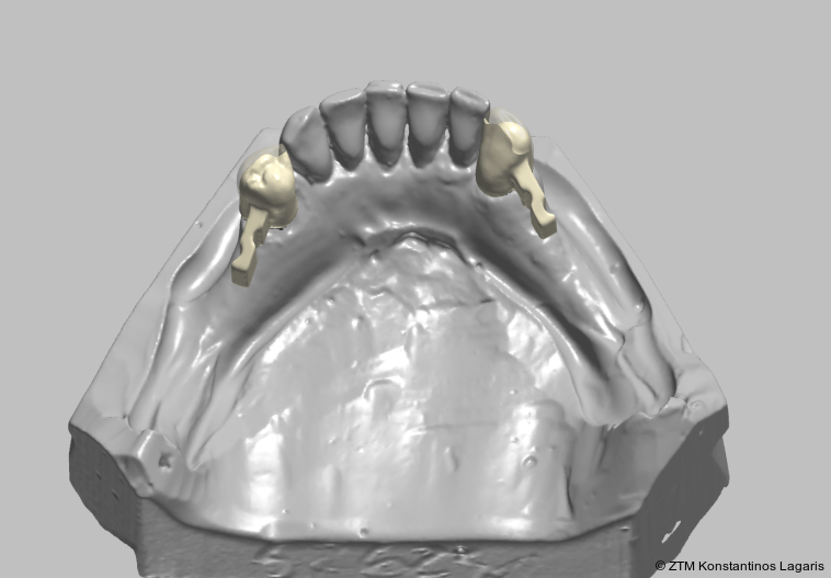 Anschließend erfolgte die Konstruktion der Sekundärteleskope und des Modellgusses, erneut im Programm 3Shape. Die Primärteile sowie das Modell wurden zuvor mit einem optischen Laborscanner eingescannt. Im Kronen- und Brückenmodul wurden zunächst die vestibulär verblendeten Sekundärteleskope designt.