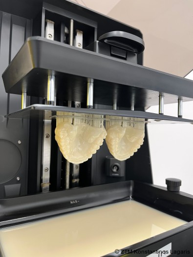 Sobald die Konstruktion des Oberkiefers abgeschlossen war, wurde die komplette Prothese als ein Datensatz exportiert, um eine Try-in-Prothese herzustellen. Diese wurde im 3D-Druckverfahren aus einem monochromen Material gefertigt.