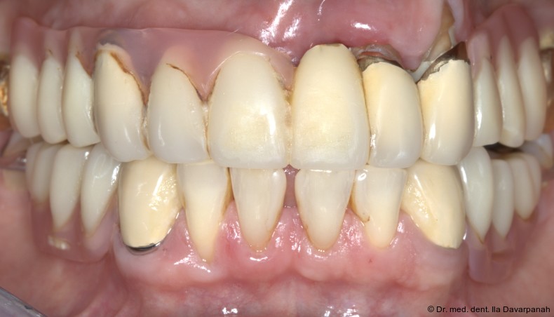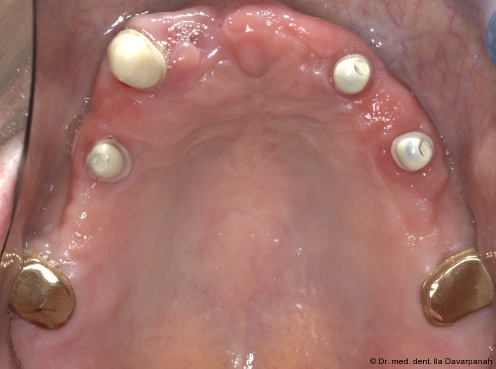 Ein 62-jähriger Patient stellte sich mit bestehendem Zahnersatz im Oberkiefer vor und äußerte den Wunsch nach einer implantatprothetischen Versorgung. Drei Restzähne im Oberkiefer waren erhaltungswürdig. Nach differenzialdiagnostischer Analyse wurde eine abnehmbare, teleskopierende Versorgung geplant. Die Zähne 17 und 27 wurden mit provisorischen Kronen aus Polymethylmethacrylat (PMMA) versorgt, spielten jedoch keine tragende Rolle in der Gesamtplanung.