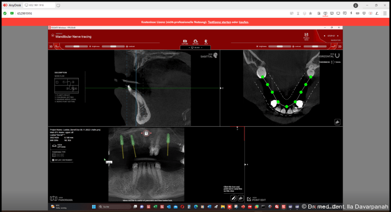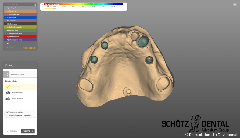 Die virtuelle Implantatplanung erfolgte nach dem Backward Planning-Prinzip. Hierzu wurden ein DVT des Schädels als Dicom-Datensatz sowie ein intraoraler Scan (Medit i700, Medit) als STL-Datensatz erstellt und für eine dreidimensionale Planung in der Planungssoftware R2Gate (MegaGen Implant Co.) importiert (Abb. 3+4). Hierfür ist eine sorgfältige Abstimmung von Datenerfassung, Planung und Fertigung wichtig. Nach Überlagerung der Daten werden die idealen prothetischen und anatomischen Vorgaben bestimmt.