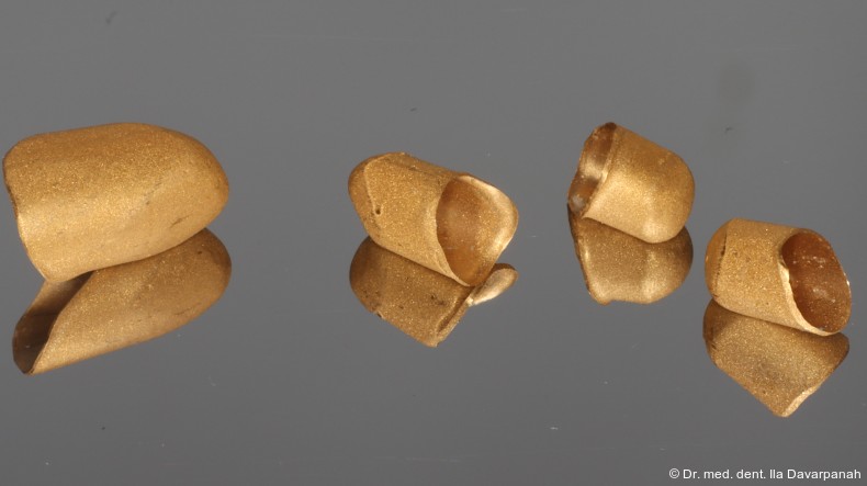 Auf Basis des digitalen Mock-ups wurden die Zirkonoxid-Primärkappen, galvanisch hergestellten Sekundärkappen sowie das NEM-Tertiärgerüst laborseitig gefertigt (Abb. 13+14). Die intraorale Verklebung der Sekundärkappen mit dem Tertiärgerüst erfolgte spannungsfrei im Mund (Abb. 15–17).