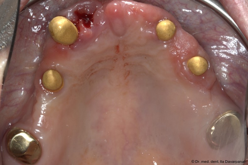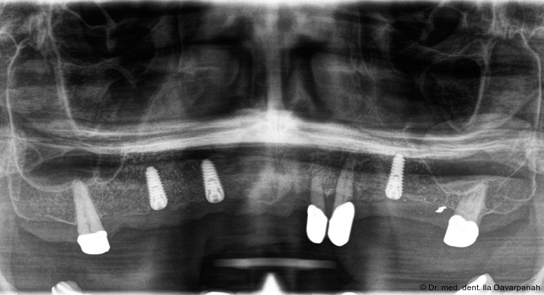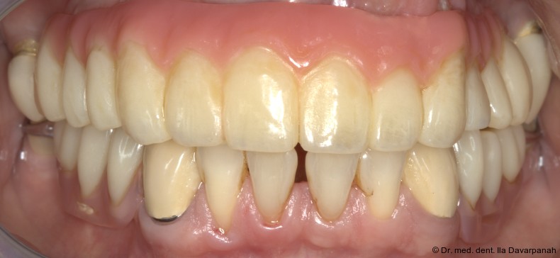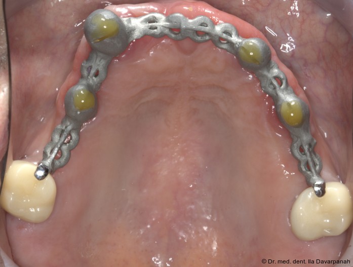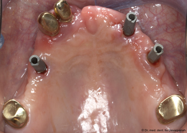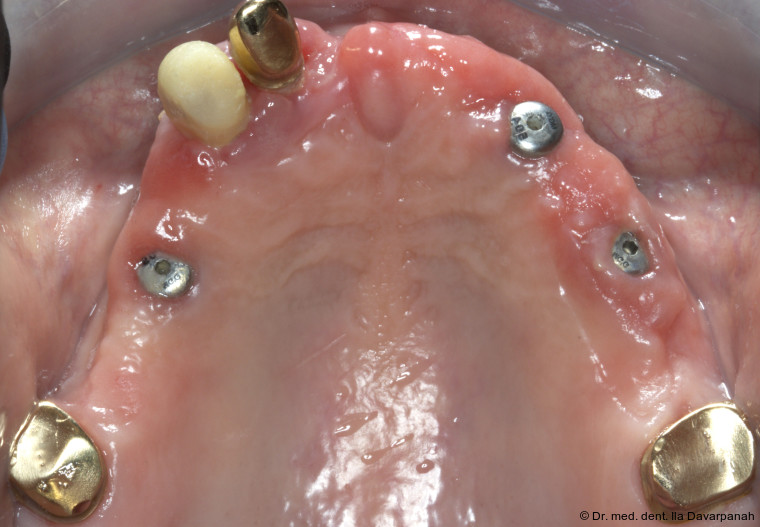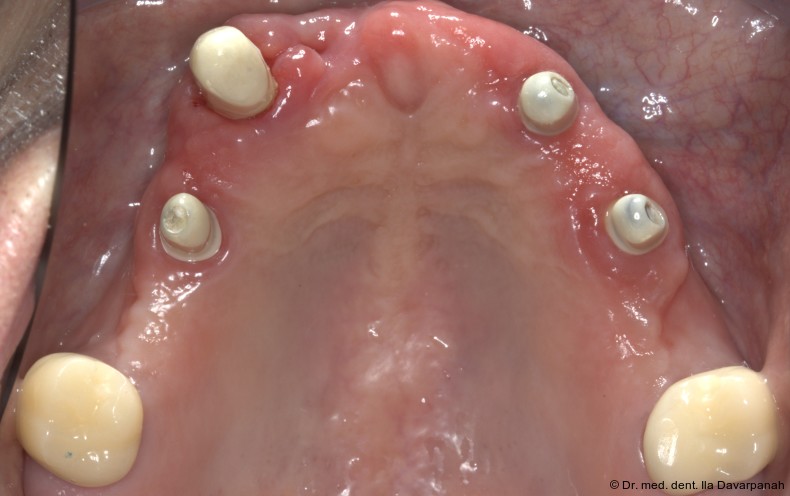 Die Implantation erfolgte navigiert mit einer Bohrschablone. Zur Optimierung der Ästhetik wurden im Frontzahnbereich bewusst keine Implantate gesetzt (Abb. 5). Nach Einheilung und Freilegung der Implantate begann die prothetische Phase (Abb. 6).