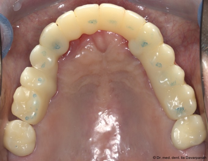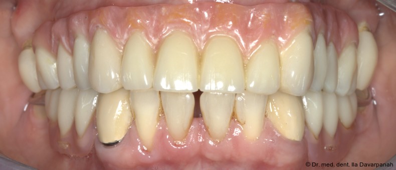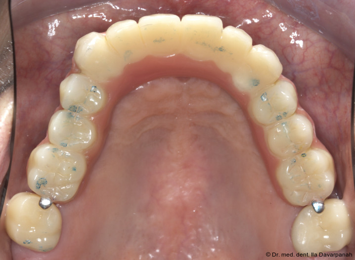 Die definitive Prothese konnte im dritten Behandlungstermin problemlos eingegliedert werden. Es waren lediglich minimale okklusale Anpassungen erforderlich (Abb. 20–24).