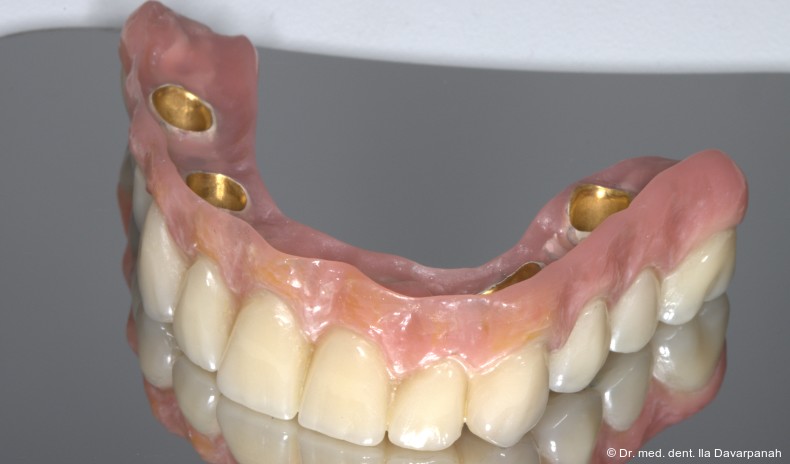Für eine Doppelkronen-Prothese werden als Mindestzahl von Implantaten bzw. Pfeilerzähnen für den Oberkiefer sechs und den Unterkiefer vier angegeben. Bei der Planung muss diese Art der Restauration gedanklich wie eine herausnehmbare Brücke behandelt werden, nicht wie eine Prothese. Das ist ein wesentlicher Aspekt für die statische Konzeption. Grund dafür ist, dass keine Kaukraft auf den basalen Schleimhautanteilen ankommt, sondern die Restauration nur auf den Halteelementen gelagert ist. Das Weichgewebe wird lediglich bedeckt und nicht belastet, was bei der Planung respektive der Statik unbedingt Beachtung finden muss.15