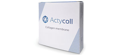 Die resorbierbare Kollagenmembran ActyColl besteht aus hochreinem Typ I-Atelokollagen equinen Ursprungs und weist eine sehr gute Biokompatibilität auf. Sie haftet zuverlässig auf dem Knochenersatzmaterial und gewährleistet über vier bis sechs Wochen eine stabile Defektabdeckung – in der Regel ohne zusätzliche Fixation. Aufgrund ihrer natürlichen Resorption ist kein zweiter chirurgischer Eingriff zur Entfernung der Membran erforderlich. ActyColl lässt sich einfach in situ platzieren und passt sich gut an die Defektmorphologie an. Während der Anfangsphase der Heilung schützt sie die Augmentationsstelle vor dem Einwach sen von Weichgewebe und dient als biologische Matrix für die Entwicklung von Knochen, Weichgewebe und Blutgefäßen. Gleichzeitig ermöglicht sie den Austausch wichtiger Nährstoffe und unterstützt so den Heilungsprozess. Die Membran ist einzeln steril verpackt und in fünf Größen von 15 × 20 mm bis 30 × 40 mm bei einer Dicke von 0,2 mm erhältlich. Sie kann unteranderem in Kombination mit den Knochenersatzmaterialien OssaBase-HA und PORESORB-TCP für verschiedene Indikationen der gesteuerten Knochenregeneration eingesetzt werden.