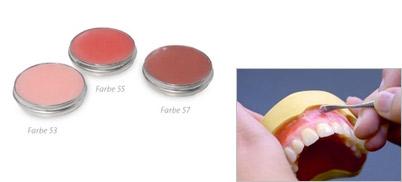 Zu den besonderen Vorteilen zählen unter anderem die außergewöhnliche Geschmeidigkeit, das ideale Fließverhalten sowie die gute Modellierfähigkeit. Es besteht nun die Möglichkeit, die in Wachs aufgestellte Prothese mit dem Soft-Wachs in Farbe 34 herzustellen und mit den Modellierwachsen MEDIUM und HARD auszu-modellieren. Zusätzlich kann mit den Charakterisierungswachsen in den Farben 53, 55 und 57 auf einfache und schnelle Weise eine individuelle Einfärbung der Wachsgingiva vorgenommen werden.