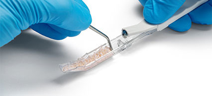 Die Entnahmekammer fasst bis zu 2 cm³ und besteht aus transparentem Material, was eine visuelle Einschätzung der gesammelten Knochenspäne erlaubt. Durch das Mischen mit Knochenersatzmaterialien wie CeraOss® HYA oder MinerOss® A +HYA entsteht „Sticky Bone“ mit klebriger Konsistenz. Diese Beschaffenheit stabilisiert das Augmentat während der Anwendung, sorgt für eine optimale Anpassung an die Defektstelle und wirkt sich zusätzlich positiv auf die Wundheilung aus. Der Bone Scraper ist zum Einmalgebrauch bestimmt. Er wird in einer Einzelverpackung mit fünf einzeln steril verpackten Einheiten geliefert.
