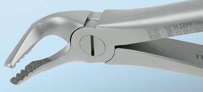 entgegenwirkt. Für die parodontale Mikrochirurgie ist die gebogene Mikroschere das Instrument der Wahl. Sie verfügt auf einem Blatt über eine Mikrozahnung, welche das Abgleiten von Weichgewebe und Faden zuverlässig verhindert. Mit der neuartigen geschützten Haltefunktion kann die Schere zur Nahtdurchtrennung und zur anschließenden Fadenentfernung verwendet werden. Der Mikro-Skalpellgriff aus Titan lässt aufgrund seines geringen Gewichts und seiner Form eine exakte und genaue Schnittführung zu. Das Auswechseln der Klingen ist durch die mit einem Drehverschluss ausgestattete Spannzange sehr angenehm und sicher durchzuführen. Die neuen Mikro-Nadelhalter wurden im Bereich des Instrumentenschlusses technisch modifiziert. Der Schraubenschluss wurde durch einen neuen, in der Achse verlaufenden Drehschluss ersetzt. Dieser verhindert zuverlässig, dass Nahtmaterial beim Knüpfen hängen bleibt. Beste Funktionalität wird außerdem durch ein neues Fertigungsverfahren der Schließmechanismen gewährleistet, was speziell in der Mikrochirurgie ein gefühlvolles Schließen und Öffnen der Instrumente erlaubt und einen stets gleichbleibenden Kraftaufwand bei der Bedienung sicherstellt.