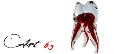 Art63 ist ein neu gegründetes Designunternehmen, das mit der anerkannten Glaskünstlerin Berit Johansson zusammenarbeitet. Der Unternehmensgründer Richard Krefting kontaktierte Berit Johansson 2008 persönlich, nachdem ihn die Kunstfertigkeit ihrer Werke tief beeindruckt hatte. Besonders faszinierten ihn die hellen Farben und ausdrucksstarken Formen. Mittlerweile ist aus der schon anfänglich guten Zusammenarbeit eine große Vertrautheit gewachsen. Richard Krefting ist von Beruf eigentlich Zahntechniker, doch er hatte schon immer auch ein großes Interesse für die Kunst. Deshalb war es nur eine Frage der Zeit, bis er die Idee zu einem aus Glas gefertigten Zahnkunstwerk hatte und diese natürlich mit Berit Johans-son teilte. Berit Johansson war so- fort fasziniert und sah in dem Projekt eine interessante künstlerische Herausforderung. Die größte Aufgabe stand allerdings Glasbläsermeister Silvano Signoretto bevor, der den gläsernen Zahn auf künstlerische Art und Weise zum Leben erwecken musste. Er entschied sich für venezianisches Muranoglas und eine alte römische Fertigungstechnik, die Sommerso genannt wird. Zum Vorbild nahm er sich ein vergrößertes anatomisches Zahnmodell einer zahnmedizinischen Fakultät in Göteborg.