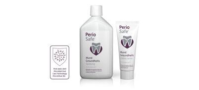 Zum PerioSafe Care Pflegesystem gehören die PerioSafe Mundgesundheits-Zahncreme und die PerioSafe Mundgesundheits-Spülung. Beide Produkte sind durch Einsatz von Mikrosilber, reinen Silberpartikeln mit hoher Oberfläche, antimikrobiell wirksam. Sie eignen sich für die dauerhafte Anwendung zur Kontrolle eines oralen Biofilms zwischen den professionellen Reinigungen.