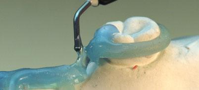 Beim Freilegen der Präparationsgrenze an Gipsstümpfen verdeckt entstehender Staub ständig die Anzeichnung. Bisher musste man das Handstück beiseite legen, das Drucklufthandstück aufnehmen und den Staub wegblasen, um wieder „freie Sicht“ zu haben. Dieser Aufwand musste mehrer Male wiederholt werden, bis die Arbeit fertig war. Der Einsatz des primotec Twister verspricht hier Abhilfe. Druckluft, die durch einen flexiblen Metallgelenkschlauch geführt wird, sorgt für ein sauberes, staubfreies Arbeitsfeld. Bei niedriger Drucklufteinstellung entsteht ein kontinuierlicher, leichter Luftstrahl direkt auf die Stelle, wo sie gebraucht wird. Richtig ausgerichtet, wirbelt er den Staub nicht auf, sondern bläst ihn direkt in die Absauganlage. Die Sicht auf die angezeichnete Präparationslinie bleibt frei und es kann zügig gearbeitet werden. Durch die „Lenkung“ der Schwebstoffe direkt in die Absaugung bedeutet die Verwendung des Twisters auch eine Reduzierung der Feinstaubbelastung im Labor. Selbst weitaus gröbere Späne, z.B. beim Ausarbeiten einer Aufbissschiene aus Kunststoff mittels Fräse, werden bei Verwendung des Twisters direkt in die Absaugung geblasen. Das Werkstück und Arbeitsfeld bleiben sauber.