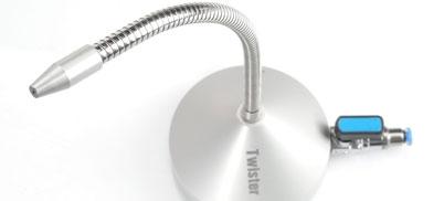 Der aus hochwertigen Materialien gefertigte Twister verfügt dank des CNC-gefrästen Aluminium-Kegelfußes über einen sicheren Stand. Der flexible Edelstahl-Metallgelenkschlauch ermöglicht die genaue Ausrichtung des Luftdruckstrahls in alle Richtungen. Sehr komfortabel arbeitet es sich mit dem Twister TWO: zwei variabel voreinstellbare Druckstufen sind mittels Zwei-Stufen-Fußschalter, entsprechenden Magnetventilen und elektronischer Steuerung dann abrufbar, wenn man die Druckluft benötigt. Gerade bei Verwendung der starken Drucklufteinstellung lässt sich hier die Geräuschentwicklung auf die Zeit beschränken, bei der man die Druckluft auch benötigt.