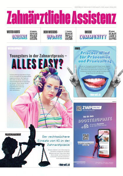 Unsere Leserschaft: fortbildungsaktive Zahnärzte, Meinungsbildner sowie Mitglieder von Fachgesellschaften und Berufsverbänden – u.a. in den Bereichen Implantologie, Oral- und MKG-Chirurgie, Endodontie, Parodontologie, Laserzahnmedizin und Ästhetische Zahnmedizin. Neben der Hauptausgabe erscheint vier Mal jährlich das Supplement Zahnärztliche Assistenz.