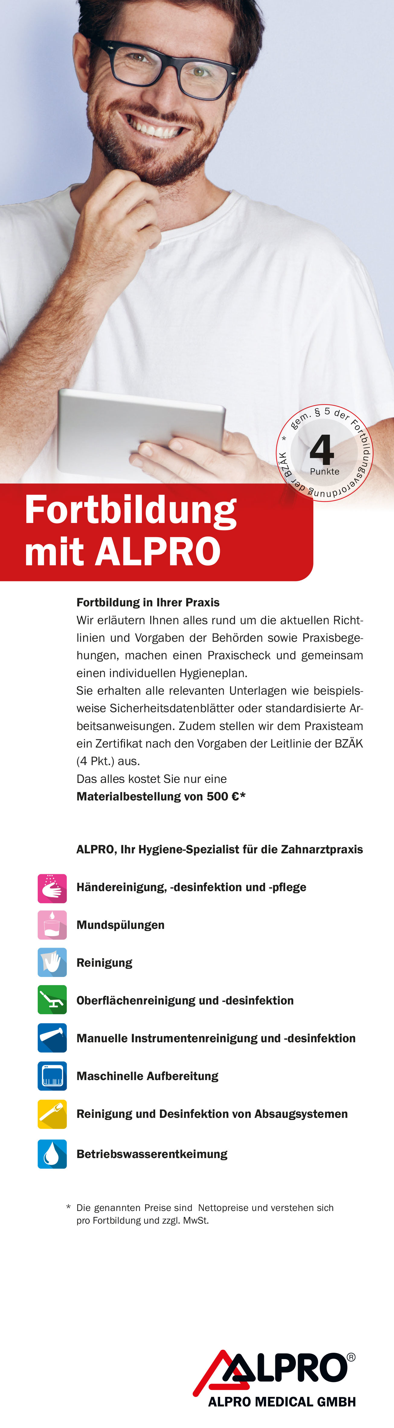 Hochwertige Produkte für den Infektionsschutz zu entwickeln und zu produzieren, ist seit mehr als 25 Jahren unsere Passion. Durch Kundennähe gepaart mit intensiver Forschung und Entwicklung, gelingt es uns bei ALPRO MEDICAL immer wieder praxisgerechte, effektive und trotzdem umweltfreundliche Produkte zur Reinigung und Desinfektion für die Zahnmedizin und Allgemeinmedizin anzubieten. Hierzu zählen im besonderen die Spezialprodukte zur Aufbereitung von zahnärztlichen Übertragungsinstrumenten, wie auch die Produkte zur Betriebswasserentkeimung und deren Zusatzgeräte.