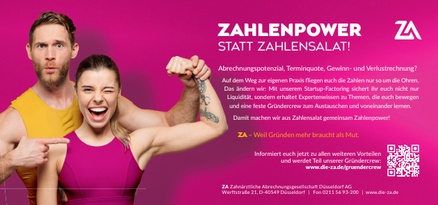 Im Zentrum stehen dabei leistungsstarke Factoring-Produkte, die durch umfassende Dienstleistungen wie individuelle Abrechnungslösungen, maßgeschneiderte Coachings oder Unterstützung bei der Praxisgründung, -übernahme und -abgabe ergänzt werden. So hält die ZA nicht nur den Zahnmedizinern, sondern dem gesamten Praxisteam den Rücken frei – damit Praxisprozesse ohne Störung laufen und sie sich ganz auf ihre Patienten konzentrieren können. Ein Großteil der Gewinne fließt dabei im Sinne des Genossenschaftsprinzips in ausgeklügelte Projekte für Kunden und die gesamte Zahnärzteschaft zurück.