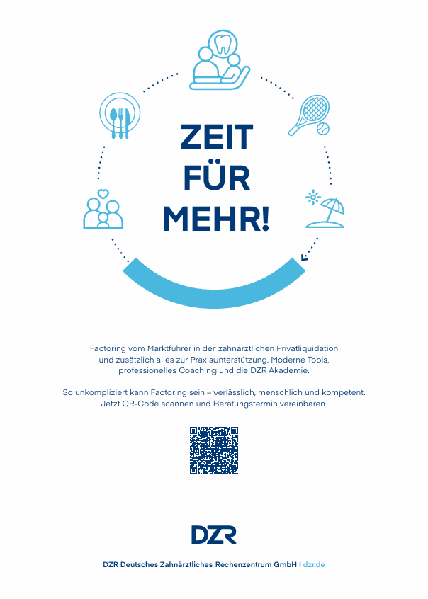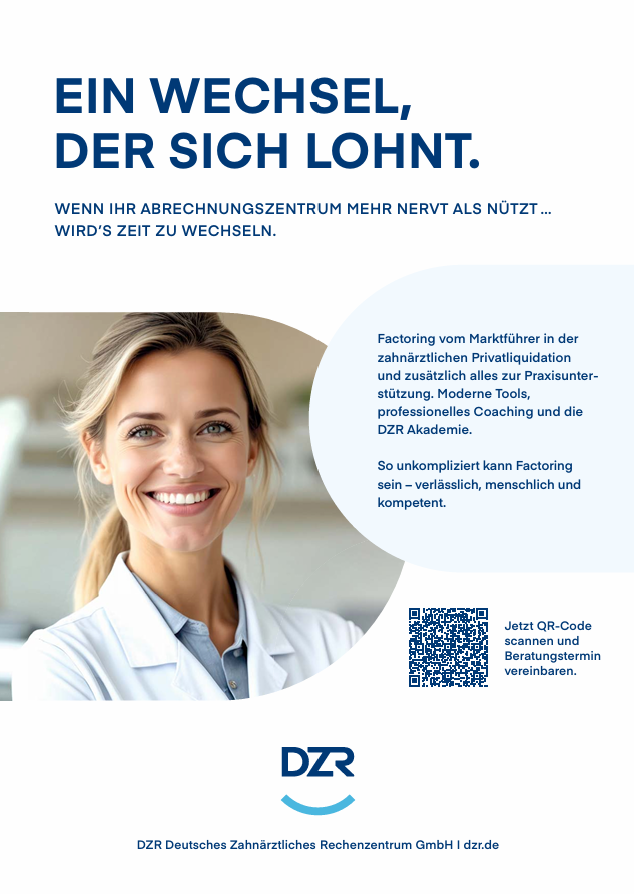 Das DZR ist ein Abrechnungs- und Factoringunternehmen für niedergelassene Zahnärztinnen und Zahnärzte, MKG-Praxen und weitere dentale Facharztbereiche. Über 300 Mitarbeiter stehen unseren über 7.000 Kunden mit Rat und Tat zur Seite – deutschlandweit und persönlich. In Bayern sind wir mit der ABZ-ZR Zahnärztliches Rechenzentrum für Bayern GmbH vertreten. Bei uns dürfen Sie mehr erwarten. Factoring und Abrechnungsqualität vom Marktführer in der zahnärztlichen Privatliquidation und zusätzlich alles für Ihre ideale Abrechnung. Moderne Tools, professionelle Coaching und die DZR Akademie.