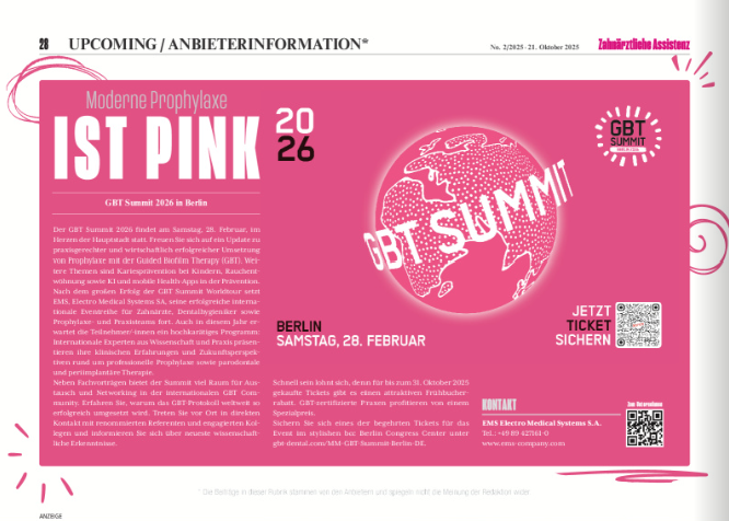 Mit GBT stellen wir gemeinsam die individuelle Mundgesundheit in den Mittelpunkt. Sie, als Dental Professional bieten den Patienten genau die Prophylaxe, die sie benötigen - in einer minimalinvasiven Art und Weise: Prävention von Karies, Gingivitis, Parodontitis, periimplantärer Mukositis, Periimplantitis und Zahnsteinbildung. Nur EMS bietet Ihnen seit 1981 die original Innovationen, Lösungen und Produkte für mehr Umsatz mit Prophylaxe.