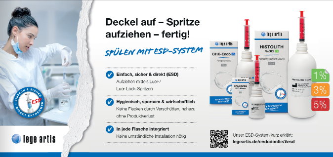 Den Trend zur Wirtschaftlichkeit, zu schnellen, sicheren und hygienischen Lösungen greift das Familienunternehmen mit dem patentierten ESD-Entnahme-System für Endo-Lösungen auf, welches in jeder Flasche integriert ist. Mittels Luer-/Luer-Lock-Spritzen können Lösungen einfach, sicher und direkt entnommen werden – Flecken, Produktverluste und Hygieneprobleme gehören damit der Vergangenheit an.