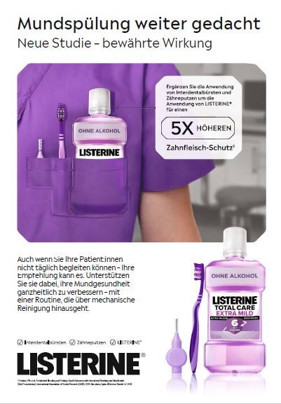 LISTERINE® ist eine Marke der Kenvue Germany GmbH und gilt mit 145 Jahren Expertise als Wegbereiter einer fortschrittlichen Mundpflege. LISTERINE® ist mit über 150 Studien die meisterforschte Mundspülung und bietet im Rahmen der täglichen 3-fach-Prophylaxe eine optimale Ergänzung zur mechanischen Zahnreinigung mit Zahnbürste und Interdentalpflege. LISTERINE® Mundspülungen enthalten eine einzigartige Kombination aus ätherischen Ölen mit antibakterieller Wirkung. Zweimal täglich angewendet, bekämpft LISTERINE® bis zu 99 % der nach dem Zähneputzen verbleibenden Bakterien, wodurch eine sehr gute Kontrolle des dentalen Biofilms ermöglicht wird. Somit unterstützt LISTERINE® bei der Prävention von Plaque und Zahnfleischentzündungen und trägt zum Erhalt der Mundgesundheit bei.