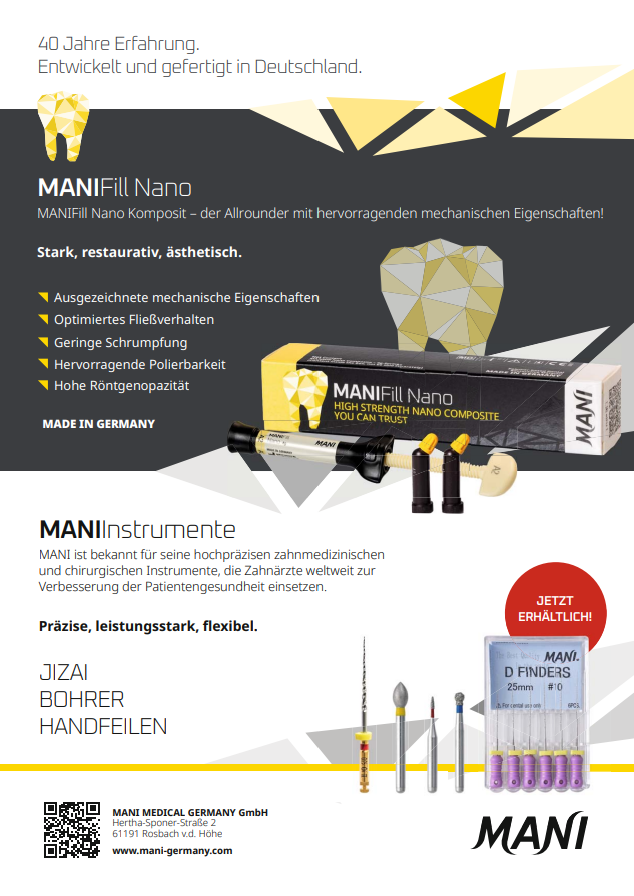 Die Stärke von MANI liegt in der Verbindung von Tradition und Innovation: Vom ersten chirurgischen Edelstahl-Nadeltyp (1961) über die Entwicklung hochmoderner Metallskelette für Stentgrafts (2013) bis hin zu den neuen, innovativen Füllungskompositen von (2025), die höchsten Ansprüche an Ästhetik, Verarbeitung und Langlebigkeit erfüllen, hat das Unternehmen weltweit Maßstäbe gesetzt. Über 300 Patente unterstreichen den hohen Anspruch an Forschung und technische Exzellenz. Gleichzeitig sorgen internationale Zertifizierungen und die MDR-Zulassung für höchste Sicherheit und Vertrauen.