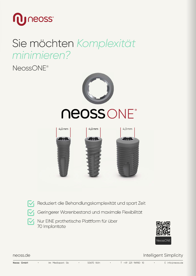 Das Neoss System wurde so entworfen, dass es eine intelligente, rationelle und uneingeschränkte prothetische Auswahl bietet. Mit dem Konzept der „Einen“ Plattform für alle Implantatdurchmesser und dem „Einen“ Schraubendreher ist die prothetische Versorgung „einfach“ und die Kommunikation zwischen Behandler und Techniker unmissverständlich. Gleichzeitig bietet sich eine große prothetische Freiheit mit unterschiedlichen Materialien, um Patienten mit hochästhetischen verschraubten oder zementierten Lösungen zu versorgen.