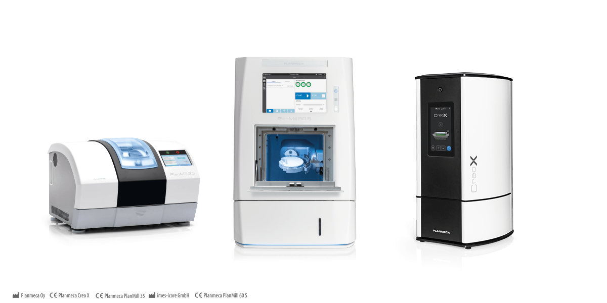 Für die anschließende Fertigung von Zahnrestaurationen, Direktapplikationen und weiteren dentalen Anwendungen stellt Planmeca leistungsstarke und zuverlässige Geräte bereit. Dazu gehören zwei speziell für die Zahnmedizin entwickelte Fräsmaschinen sowie ein betriebssicherer 3D‑Drucker – optimal abgestimmt auf die Anforderungen moderner digitaler Workflows.
