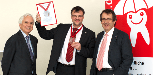 In Anerkennung und Dankbarkeit für sein Engagement zur Verbesserung der Zahngesundheit erhielt Prof. Dr. Dr. Norbert Krämer, Direktor der Poliklinik für Kinderzahnheilkunde an der Uni Gießen, die Friedrich-Römer-Ehrenmedaille der Aktion zahnfreundlich e.V. 2014.