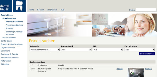 Die innovative Praxisbörse von dental bauer ist eine neue Plattform für Praxisabgeber und -gründer. Sie unterstützt Existenzgründer bei der Suche nach einer neuen Praxis und hilft Praxisinhabern bei der Präsentation ihrer abzugebenden Praxis.
