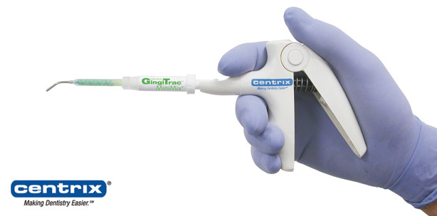 Fadenlose Gingivaretraktion. Die adstringente 1:1 VPS-Rezeptur enthält Aluminiumsulfat und ist in der von Centrix patentierten 2K-Portionskartusche MiniMix erhältlich.