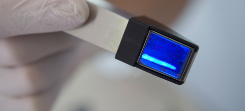 Äußerlich hat sich die Mundkamera kaum verändert. Die blaue Lichtemission zeigt aber, dass für die CEREC Bluecam eine völlig neue Aufnahmetechnologie entwickelt worden ist. Das asphärische Linsensystem und kurzwelliges Licht machen Scans schneller, schärfer und genauer. Das ermöglicht Ganzkieferaufnahmen für die abdruckfreie Praxis.