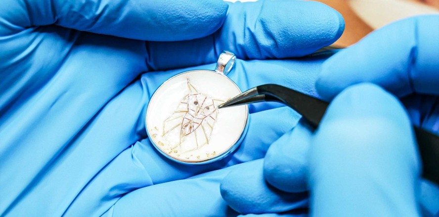Die gelernte Zahntechnikerin fertigt Erinnerungsschmuck, wie sie beschreibt. Dazu gießt sie Haare, Asche, Zähne, Teile der Plazenta, Muttermilch in Epoxidharz und bringt das Ganze nach dem Aushärten in silberne oder goldene Fassungen.