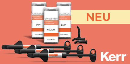 Mit nur drei Farbtönen deckt das neue SimpliShadeTM Universal Composite alle 16 VITA® classical-Farbtöne ab. Aufgrund der überzeugenden Produkteigenschaften gibt Kerr sogar eine Zufriedenheitsgarantie mit Rückgabeoption bei Nichtgefallen – auch bei geöffneten Packungen.