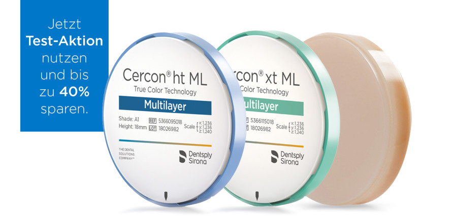 Nutzen Sie die Test-Aktion und lernen Sie Cercon ht ML, Cercon xt ML und PMMA ML in Ihrem Labor kennen. Jetzt für die Test-Aktion registrieren und b2.400is zu 40 Prozent sparen.