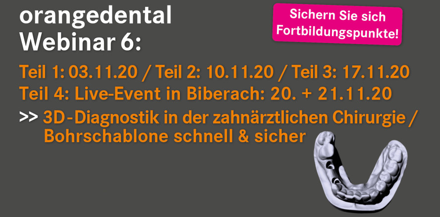 orangedental lädt Sie ein zur Webinar-Serie 6 im November 2020 mit dem Thema „3D-Diagnostik in der zahnärztlichen Chirurgie / Bohrschablone: schnell & sicher“. Teilnehmer erhalten einen Fortbildungspunkt je Termin.