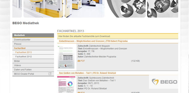 Auf der Unternehmenswebsite (www.bego.com) stellt der Bremer Dentalspezialist BEGO im Bereich der „Mediathek“ ab sofort auch online ein Portfolio an anwenderorientierter Fachlektüre für seine Kunden kostenlos zur Verfügung.