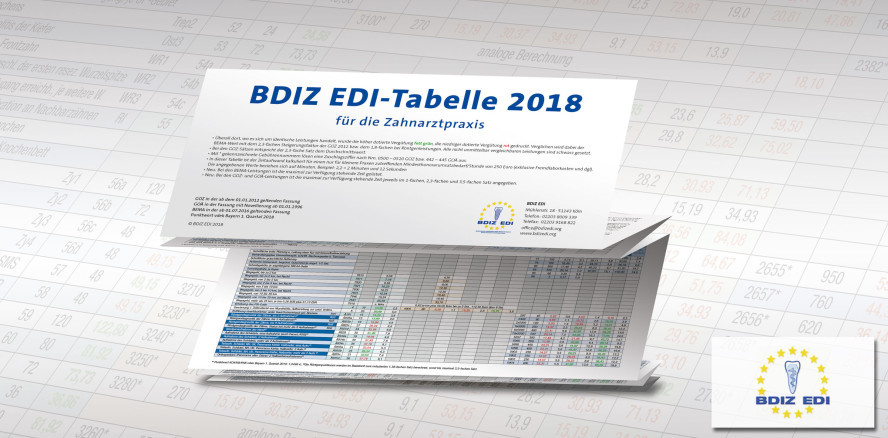 Rasche Orientierung in der zahnärztlichen Abrechnung gibt die BDIZ EDI-Tabelle 2018. Sie zeigt alle zahnärztlichen Leistungen im BEMA, in der GOZ und in der GOÄ in Euro und vergleicht direkt den BEMA-Wert mit dem 2,3-fachen Steigerungsfaktor der GOZ oder dem entsprechenden GOÄ-Wert.