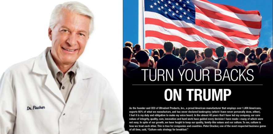 In mehreren Zeitungen schaltete Dan Fischer, der Chef des Zahnmedizin-Traditionsunternehmens Ultradent Productions, Inc., eine große Anzeige, in der er seine Landsleute auffordert, Präsident Trump den Rücken zu kehren.