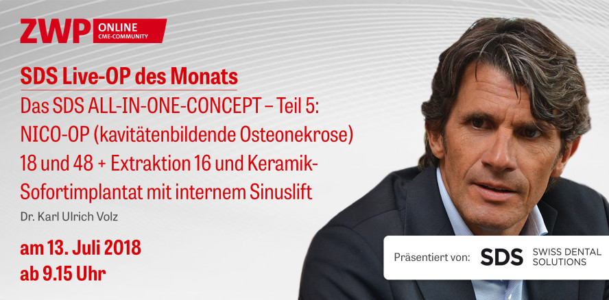Die Live-OP mit Dr. Karl Ulrich Volz findet am 13. Juli in der Zeit von 9.15 bis 11 Uhr statt. User können die OP live auf ZWP online verfolgen und einen CME-Punkt erwerben. Dr. Volz gilt als einer der Begründer der modernen Keramikimplantologie.
