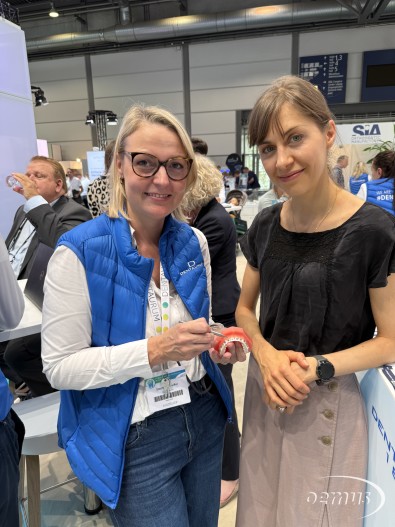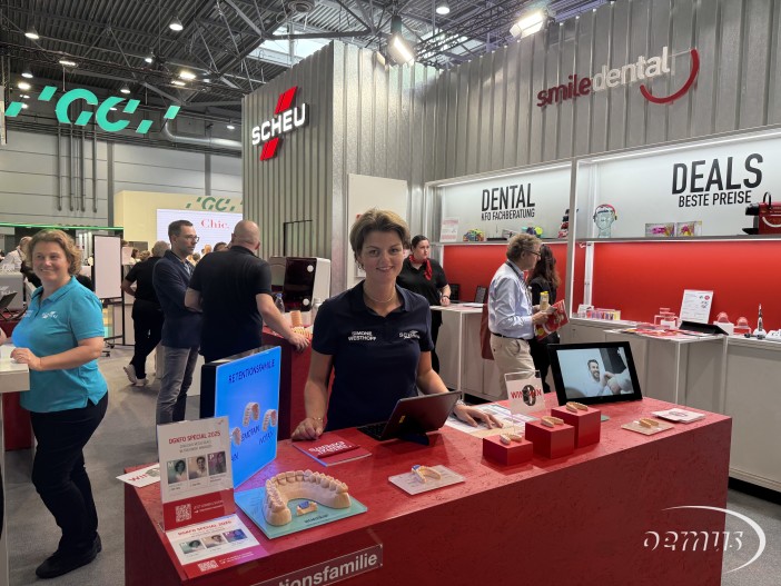 Am Stand von SCHEU hatten die Kongressbesucher die Möglichkeit, eine Apple Watch zu gewinnen. Interessierte konnten über einen QR-Code Fragen zu den Produkten stellen, die von den SCHEU-Experten über die Social-Media-Kanäle des Unternehmens beantwortet wurden. Für SCHEU war dies eine tolle Gelegenheit, direkten Kontakt zu den Anwendern zu pflegen und die Produkte durch den Austausch zu optimieren – eine Win-win-Situation, erklärte Simone Westhoff von SCHEU. Selbstverständlich konnten sich die Besucher auch direkt am Stand von SCHEU über die Produkte informieren. Simone Westhoff stellte unter anderem den MEMOTAIN® vor. Das Besondere sei die minimale Bruchgefahr (1 Prozent) sowie die maximale Passgenauigkeit. Außerdem sei das aus Memory-Metall NITINOL gefertigte Material dünner als herkömmliche Retainer und bleibe nach der Formgebung dauerhaft stabil.