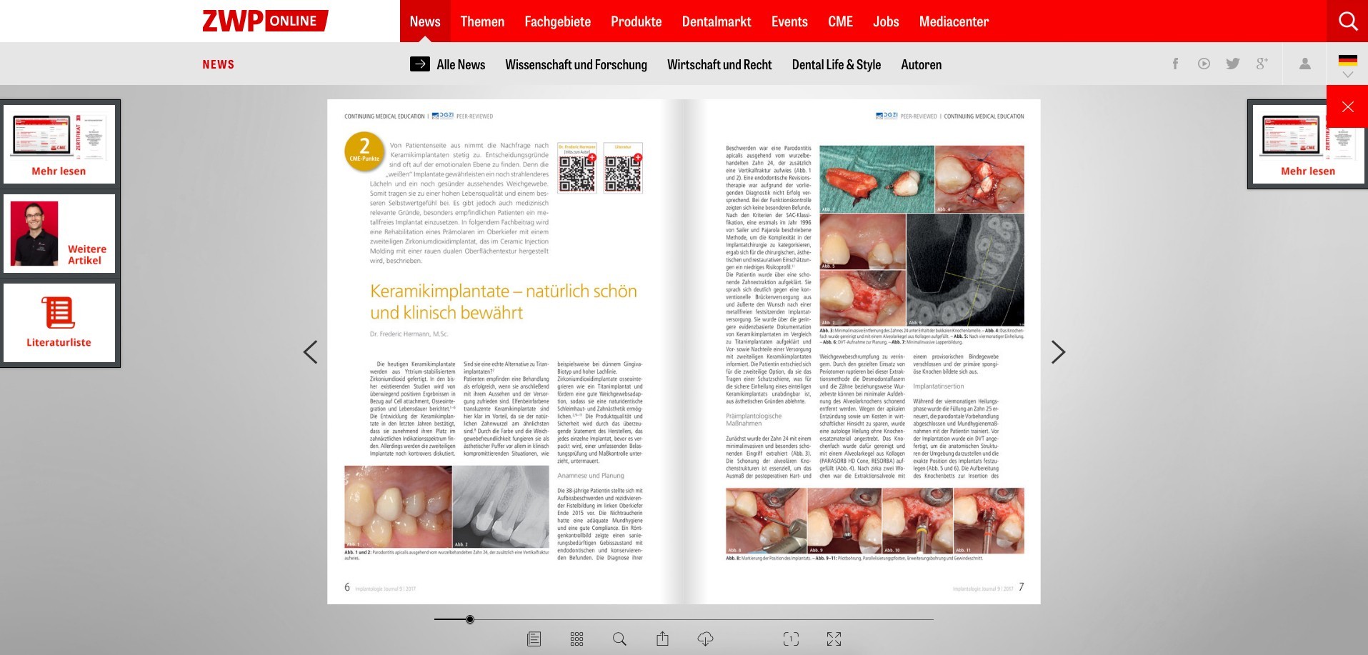 Des Weiteren wird in einer wissenschaftlichen Studie auf die Wirkung von kaltem Atmosphärenplasma auf Titanoberflächen eingegangen. Auch der CME-Artikel „Keramikimplantate – natürlich schön und klinisch bewährt“ bietet wieder interessanten Content mit Fortbildungsmöglichkeit. Das dazugehörige Live-Webinar, am 9. November 18 Uhr, sowie die Live-OP, am 20. September 9.15 Uhr, vertiefen das erworbene Wissen zusätzlich.