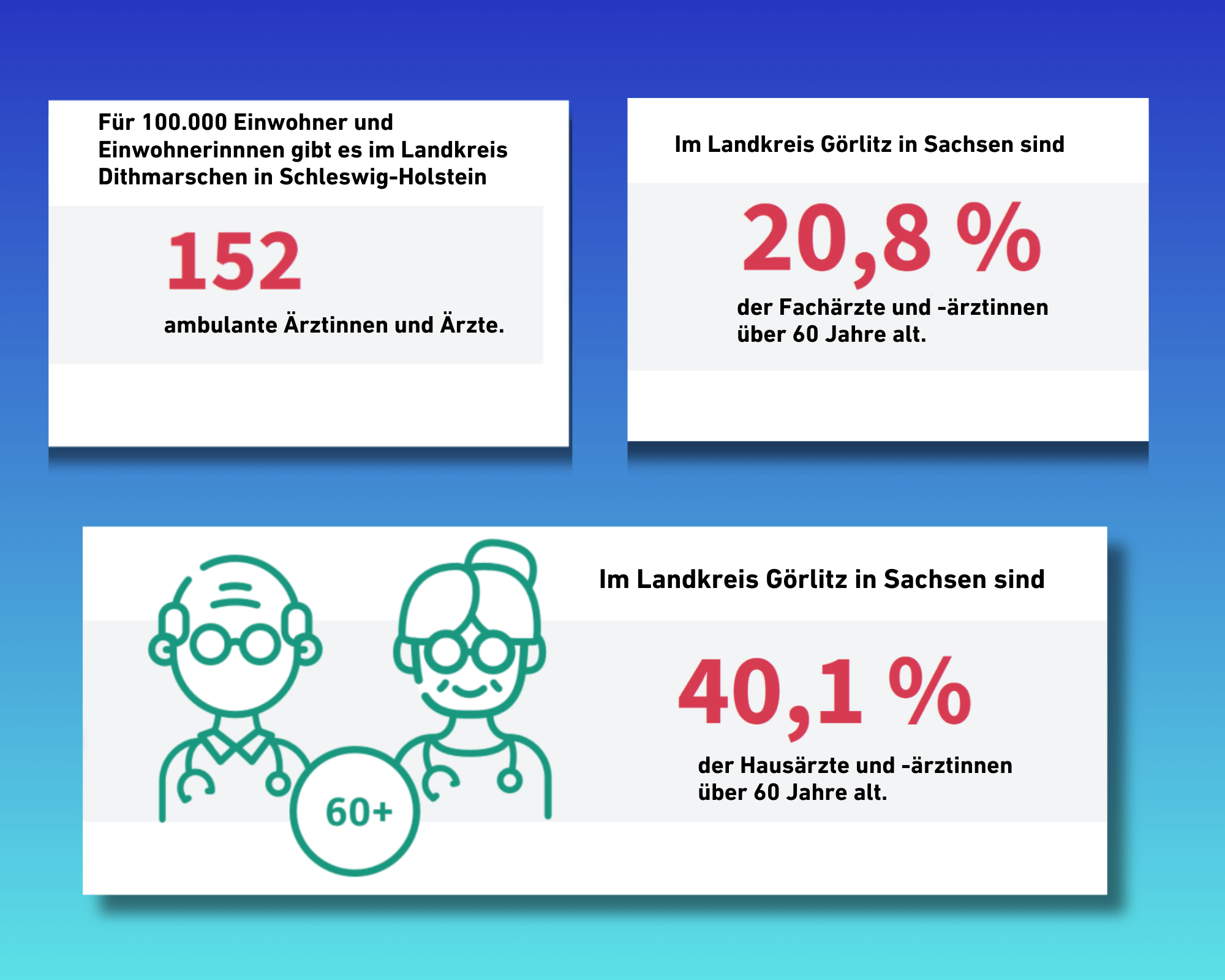 Wie hoch ist die Ärztedichte im Landkreis Dithmarschen? Wie viele Fach- und Hausärzt:innen sind im Landkreis Görlitz über 60 Jahre alt? Für das Studienprojekt „Neue Gesundheitsnetze für den ländlichen Raum“ vom Verband der Privaten Krankensicherung (PKV) hat die Stiftung Gesundheit kürzlich eine umfassende Analyse für bestimmte Regionen in Deutschland durchgeführt.