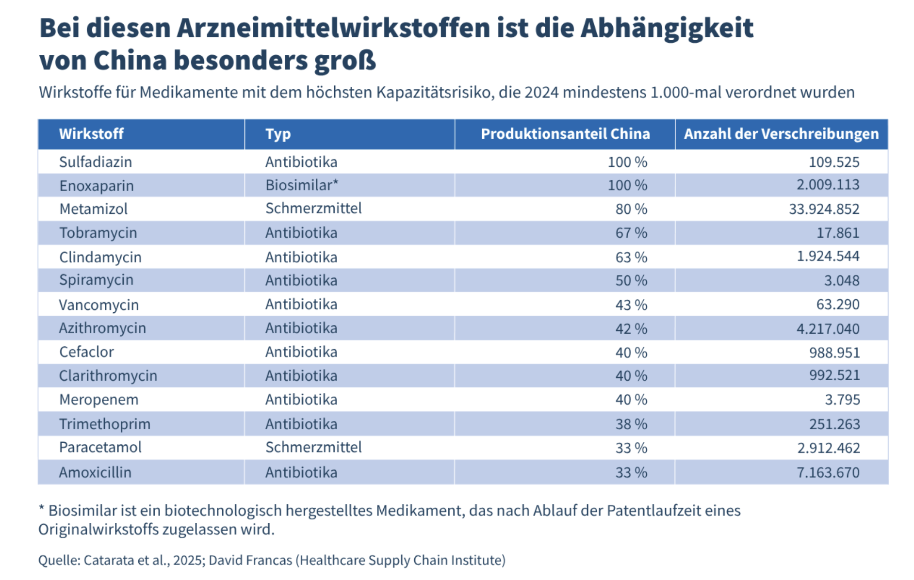 Bei 20 der 56 untersuchten versorgungsrelevanten Wirkstoffen besteht ein „hohes Kapazitätsrisiko“ – das heißt, mindestens ein Drittel der gesamten Produktionskapazitäten würde bei einem chinesischen Lieferstopp potenziell wegfallen. Käme es so weit, könnten hierzulande jährlich bis zu 42 Millionen Packungseinheiten fehlen.